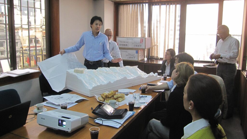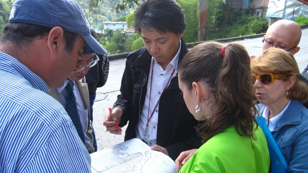 本プロジェクトを進めるにあたり、コロンビア政府はJICAに対してシニアボランティアの派遣を要請、そのサポート役として当研究室柴田らが設計支援に携わることとなった。2011~2013年の3年間にわたり、公園整備に向けた地区住民へのヒアリング、全体エリアならびにエリアごとの景観・街区設計に対するアドバイザーを担当し、シニアボランティアへの指導・技術支援やマニサレス市都市計画課、設計業務に当たった都市再生機構ERUMに対する具体的なデザイン提案と指導に従事した。