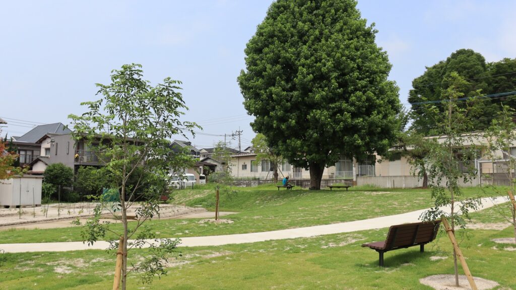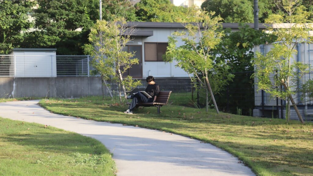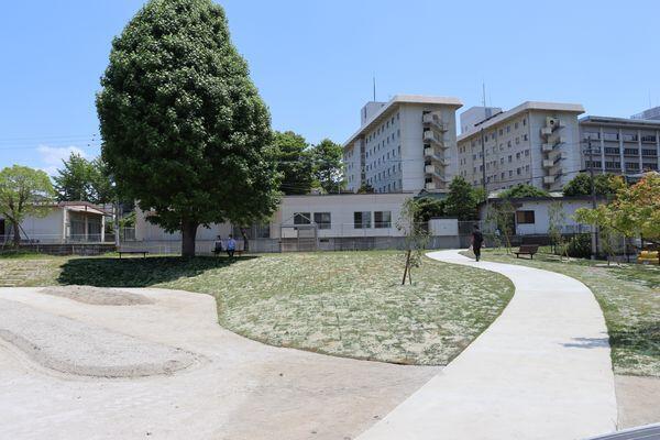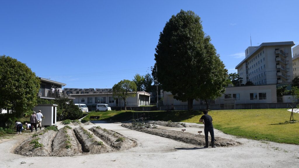 そこで2020年6月に福岡大学病院は当研究室への設計依頼とともに、それら雑草地と畑に加え、病院関係者用の駐車場、通路、ベンチなどを配した広場整備を行った。当研究室の提案によって、元々あった敷地を二分するフェンスが除去され、段差をなくし芝生の張られた緩やかな傾斜とS字を描く曲線的通路が設置された。これにより遊休地内の一体性と開放感が高まり、利用しやすい広場にリニューアルされた。