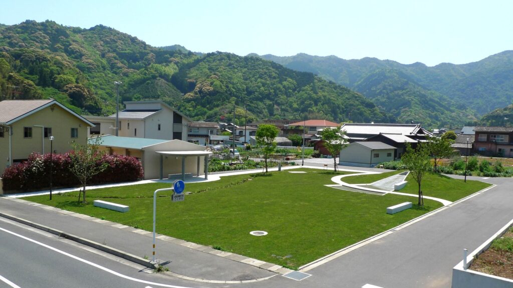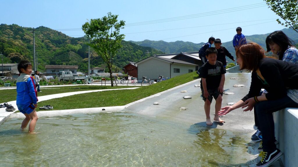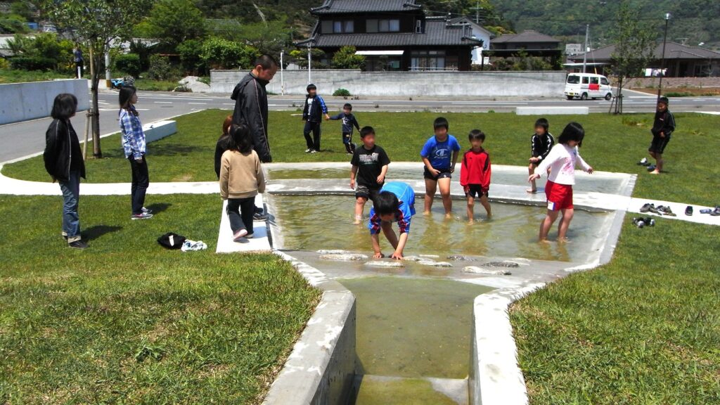 本広場のデザインでは、近隣より湧き出る天然水を園内に設けた丘に引き込み、公園内をゆっくりと流れる曲線的な めだか水路が提案されている。また丘の一部には湧水に親しむことのできる水遊び場を設置し、小さな子供でも安心して遊べる空間が提供された。さらにそうした園内や地元特産品のミカンを栽培している里山が一望できる休憩場所が設けられ、利用者の視線と見通しの良さによって周囲の風土、景観を魅力として取り込む公園のデザインが目指された。