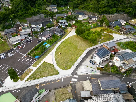本事業ではまず旧屋敷の塀を解体し、周囲からの見通しを確保、解体した塀に使われていたレンガや灰石は広場内のステップや縁石に活用し、地元資源の再利用と旧屋敷の記憶継承を図った。また南および南東に接道する民地側に歩道を組み込み、歩車分離道路として上記通学路の安全性を向上させた。日当たりの悪い東側は樹木を剪定し、段差を解消して周回できる園路を設置する等、風通しの良い伸びやかな緑の広場に生まれ変わった。また鉱山を持つ戸髙鉱業社に石灰石の支給を依頼し、蛇籠ベンチやサイン等、地元資源を活かした付属物のデザインを図った。既存井戸も手押しポンプを新設して子ども達の水遊び場として再生、中央北側はアイストップとなるヒノキのパーゴラを設け、休憩スペースとした。工事段階では近隣住民や小学生らと芝張りを行い、広場への愛着を促すきっかけづくりを企図した。
