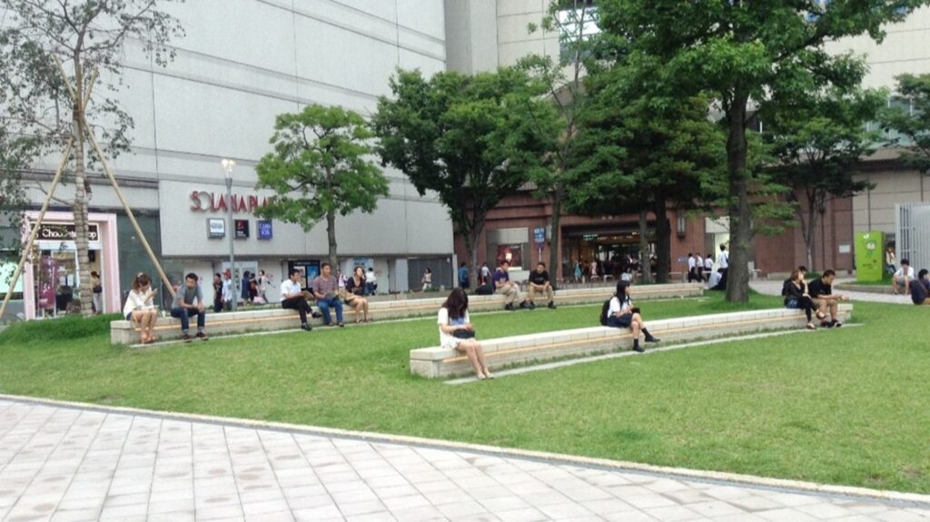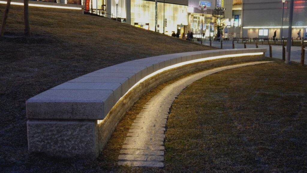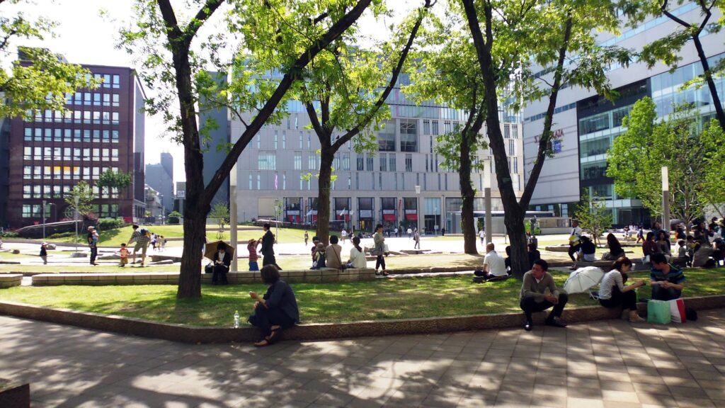 ①築山を撤去し、新たに中央園路を設け、利用者の往来と見通しの向上を図った。②旧公園に対する市民の愛着に配慮し、改修前に多くの利用があった石のベンチは、園内全体の段差を無くしたうえで以前の形に再配置した。③演出照明を内蔵した石のベンチを円弧状に新設し、芝生内に入れ込むことで騒音となっていたスケボージャンプ等の迷惑行為を抑制させた。④園内の植栽配置を調整し、隣接するソラリアプラザ開口部との連続性を確保、さらに2階カフェや西鉄福岡駅ホームから園内が見通せるようにした。⑤南側通路において死角を形成していた公衆トイレを人目につきやすい公園東部に移設、さらに通路自体の線形を直線化し、見通し改善を図った。⑥中央広場を設置し、市民の活動場所として利用しやすい空間を目指した。⑦公園西側に上記石のベンチを配した小高い「みはらしの丘」を新設し、中央広場や園内全体の光景が楽しめる休憩スペースとした。