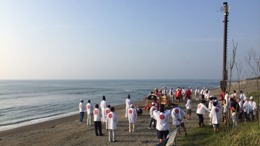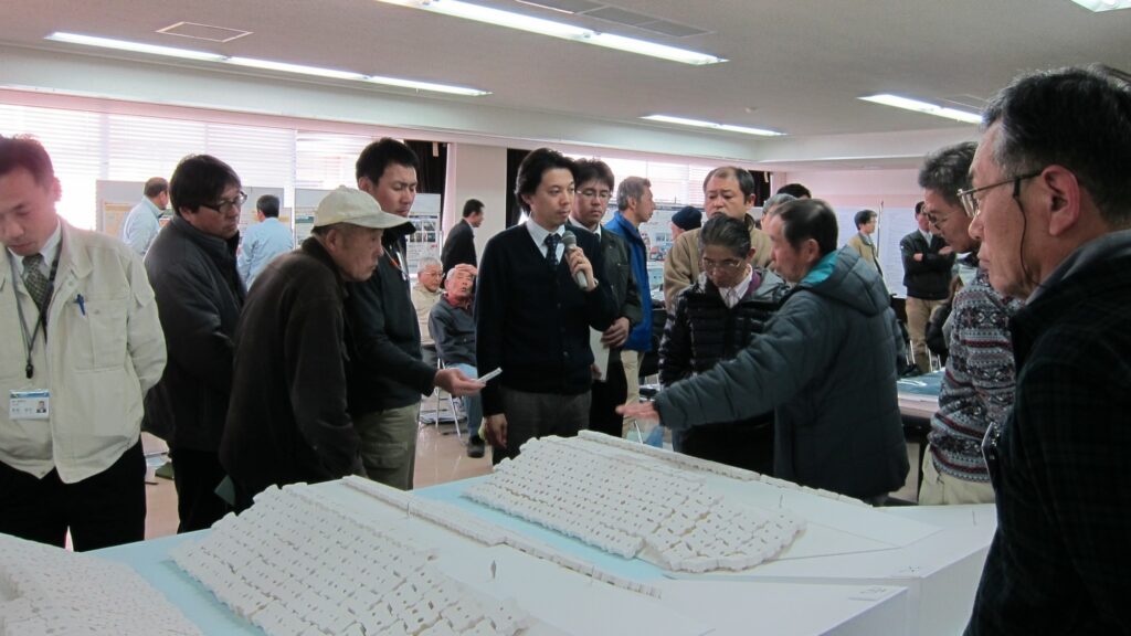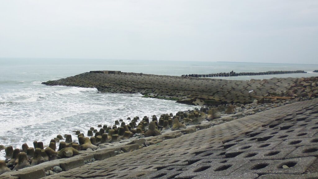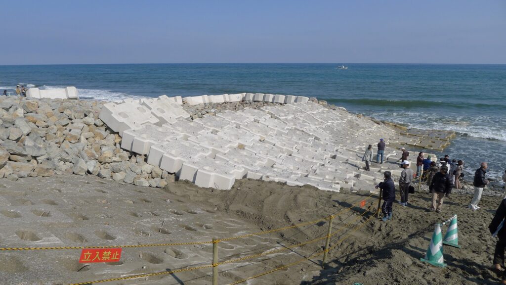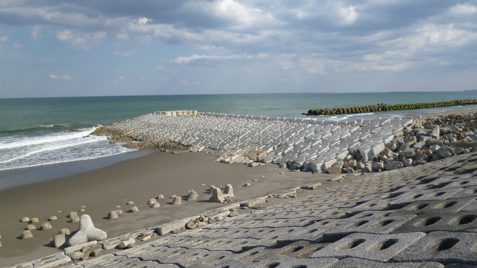 当研究室は上記侵食対策の推進に伴う景観検討に従事し、現在もなお継続的に携わっている。当研究室の検討によって、当初案のコンクリート表面に自然石を張り付けた植石ブロックが、かえって突堤を悪目立ちさせる景観阻害の可能性が指摘され、地形とのかみ合わせが良く(空隙が少なく)、既存護岸の形状と現地地盤への追随姓およびエイジングを考慮した被覆ブロックが採用と市民との合意形成に貢献した。またサンドパックの色調や材質に関する現地検討や提案に加え、砂浜に設置される海岸標識のデザインも行っている。