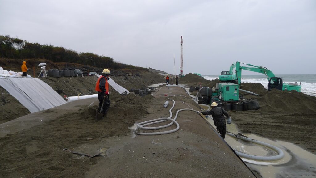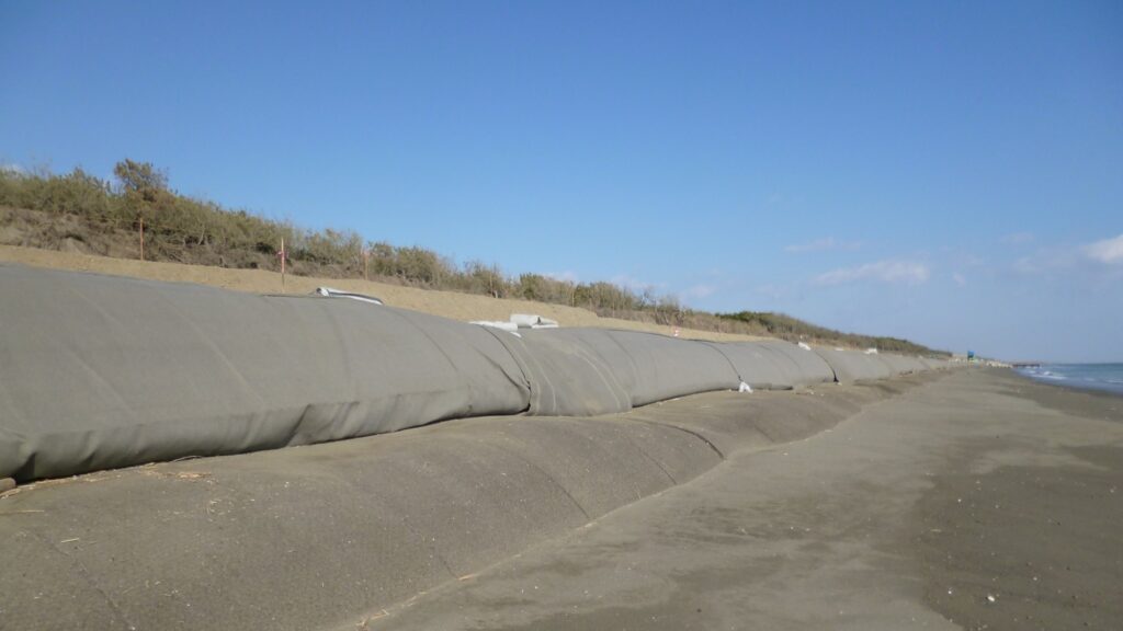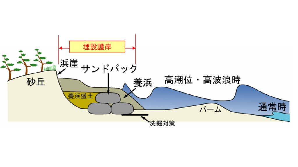 宮崎海岸は、宮崎港から一ツ瀬川の間に位置している総延長約10kmの砂浜海岸(直轄区域:L=6,856m)を指し、「住吉海岸」「石崎浜」「大炊田海岸」を総称したものである。宮崎海岸はこの数十年で砂浜の侵食が進み、平成20年4月より国土交通省九州地方整備局宮崎河川国道事務所によって「宮崎海岸侵食対策整備事業」が発足、平成24年1月からそれまでの各種検討を踏まえた事業実施と効果検証を続けている。ここでは海岸の環境や利用との調和を図りつつ、背後地への越波被害を防止するため「浜幅50mの確保」を達成目標とし、①養浜、②突堤・補助突堤、③表面を砂で覆う埋設護岸(巨大土嚢:サンドパック)の3つの工法を同時並行的に行う日本初の総合侵食対策事業が実施されている。